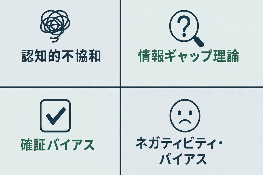不安なニュースを見続けてしまう背景には、認知的不協和だけでなく、複数の心理的メカニズムが関係しています。ここでは代表的な4つを紹介します。