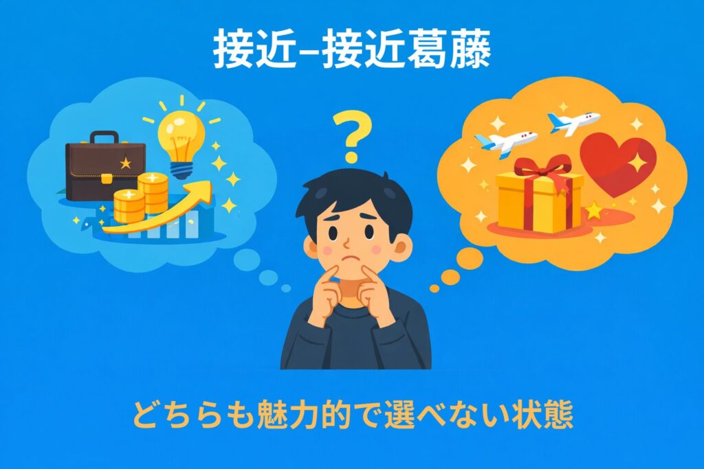 これは、ひとつの対象に「やりたい(接近)」「避けたい(回避)」の気持ちが同時に働き、行動が止まる状態のことです。