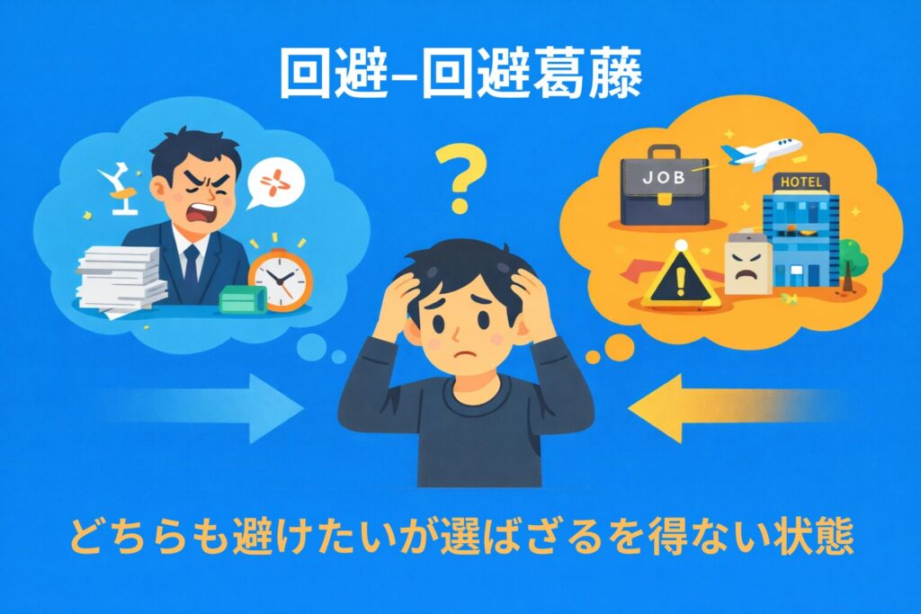 2. 回避–回避葛藤:どちらも嫌で選びづらい(例:嫌な上司と残業、嫌な取引先への出張)