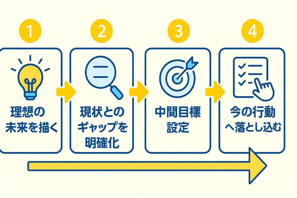 「理想的な未来の姿を先に描き、その実現のために今やるべきことを逆算して考える」思考法です。