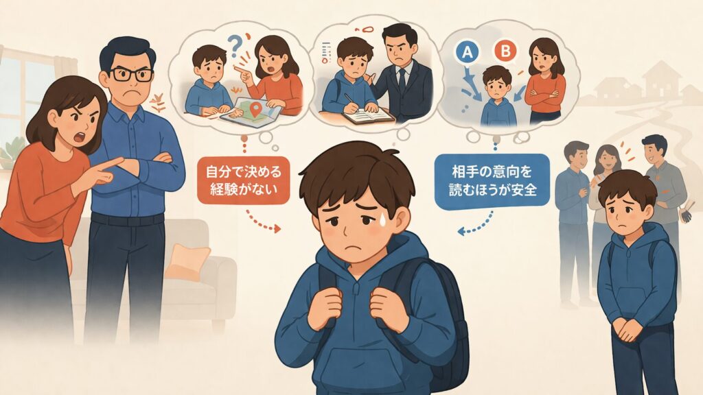 親が何でも決めてしまう、口出しが多い家庭では、子どもは「自分で判断する経験」が不足しやすくなります。