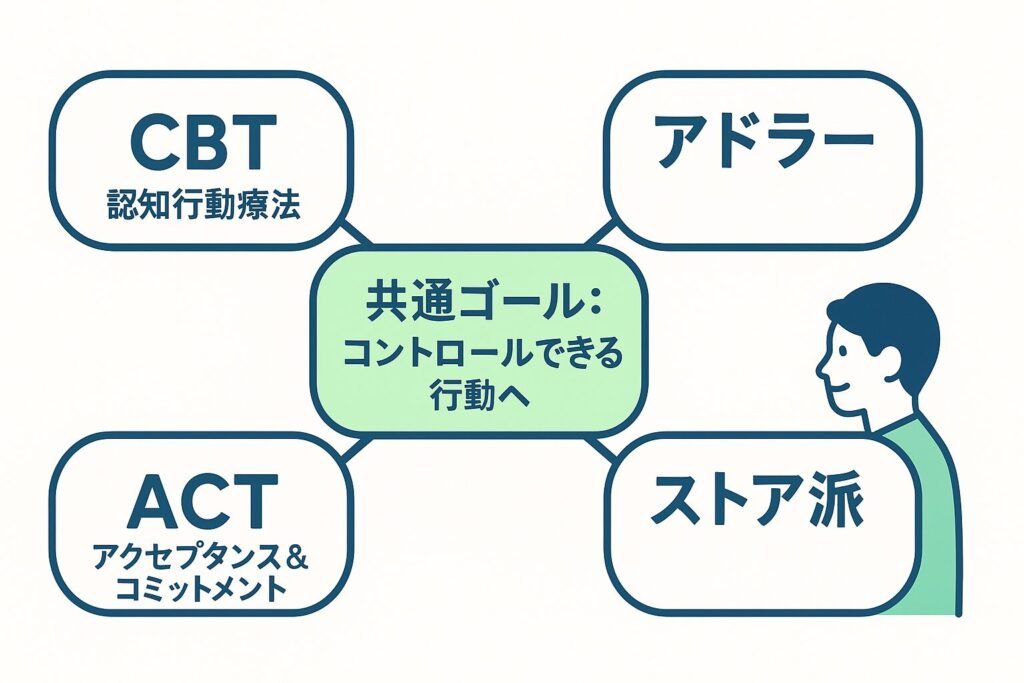 ここまで、統制感・自己効力感・ストレス評価理論・CBT/ACT・アドラー・ストア派など
