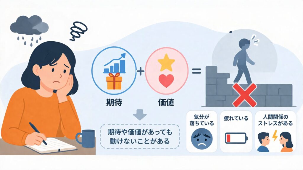 期待価値理論がうまく機能しないのは、「感情・時間・環境・習慣」など別の要因が強く影響しているときです。
