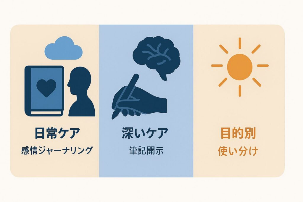 どちらも「書くことで心を整える」方法ですが、役割と効果の出る場面が大きく異なります。