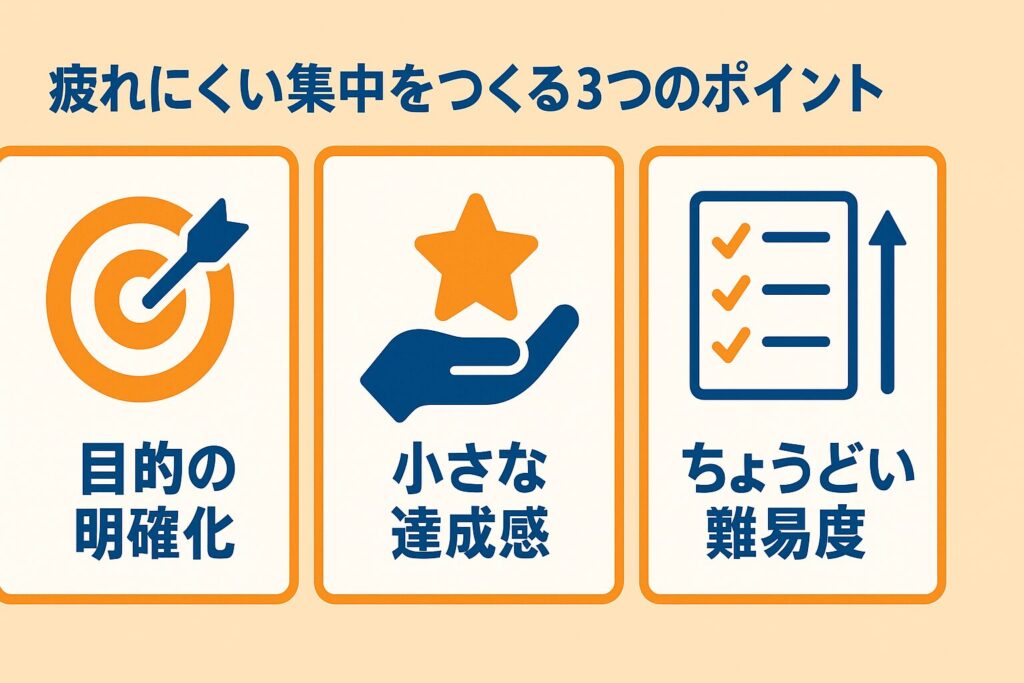 この“ミニ達成感”の積み重ねが、疲れにくく継続しやすい集中をつくるカギです。