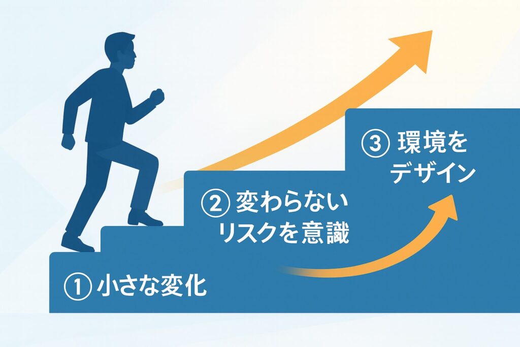 ①小さな変化で慣らす → ②変わらないリスクを見える化 → ③環境で後押し、