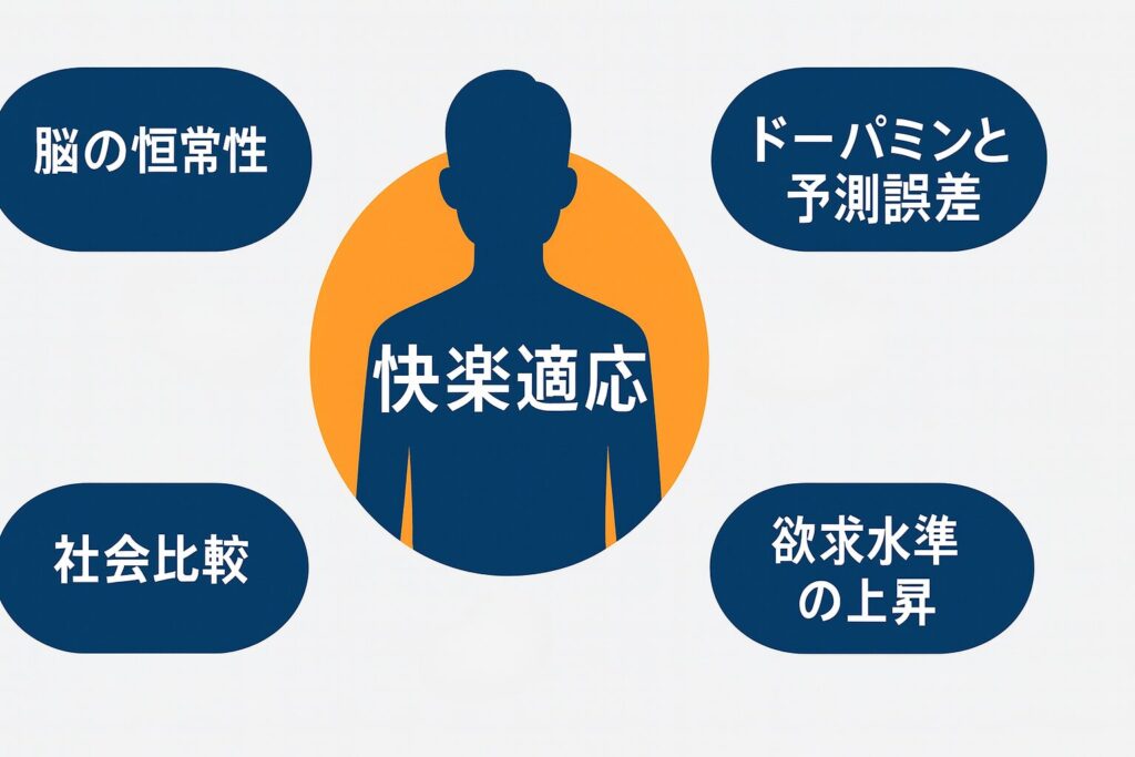 → 人は良い出来事に慣れ、幸福度が元に戻る心理現象。 - 幸せが続かないのは脳の仕組みのせい