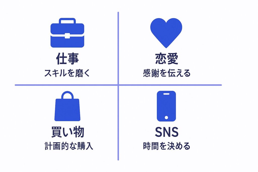 ここでは、日常で特に重要な 仕事・恋愛・買い物・SNS の4つの分野で、
