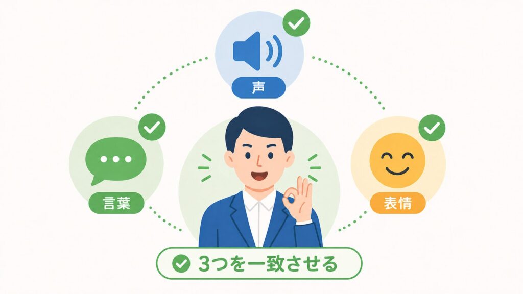 つまり、伝えたい内容と、見た目や話し方が一致していないと、相手に正しく伝わらないことがあるということです。
