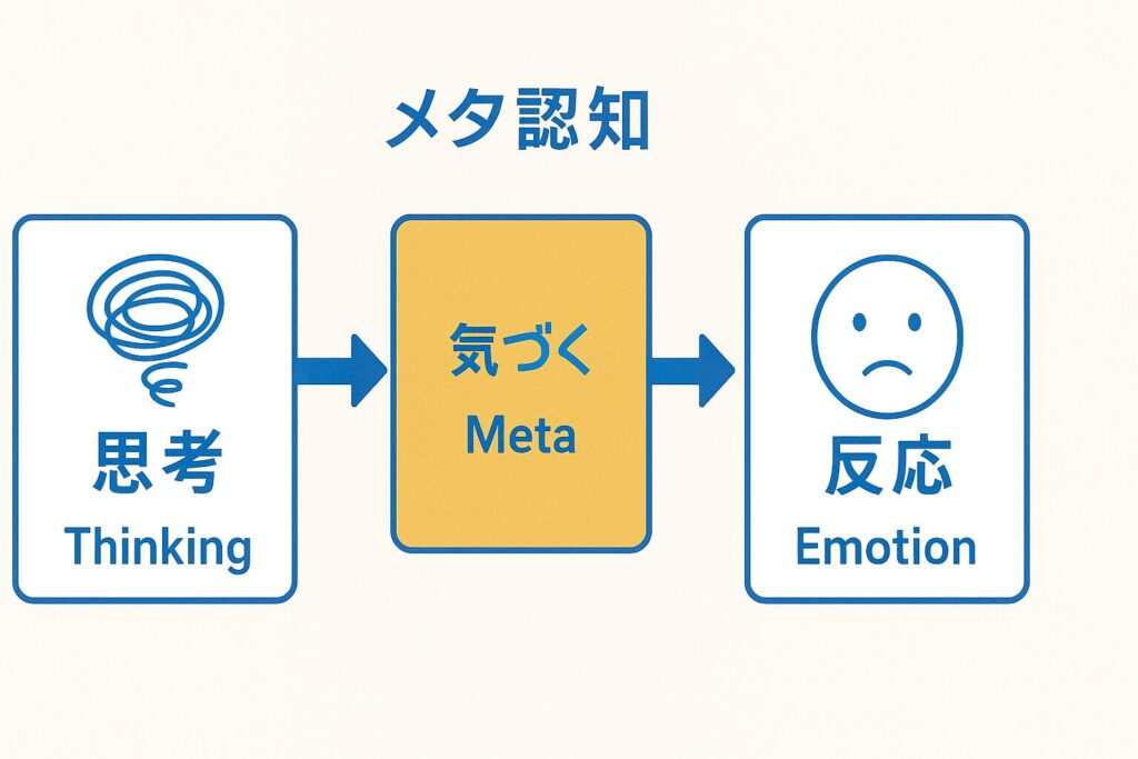 メタ認知(metacognition)とは、直訳すると「認知についての認知」、つまり自分の考えや感情を一歩引いて見つめる力のことです。