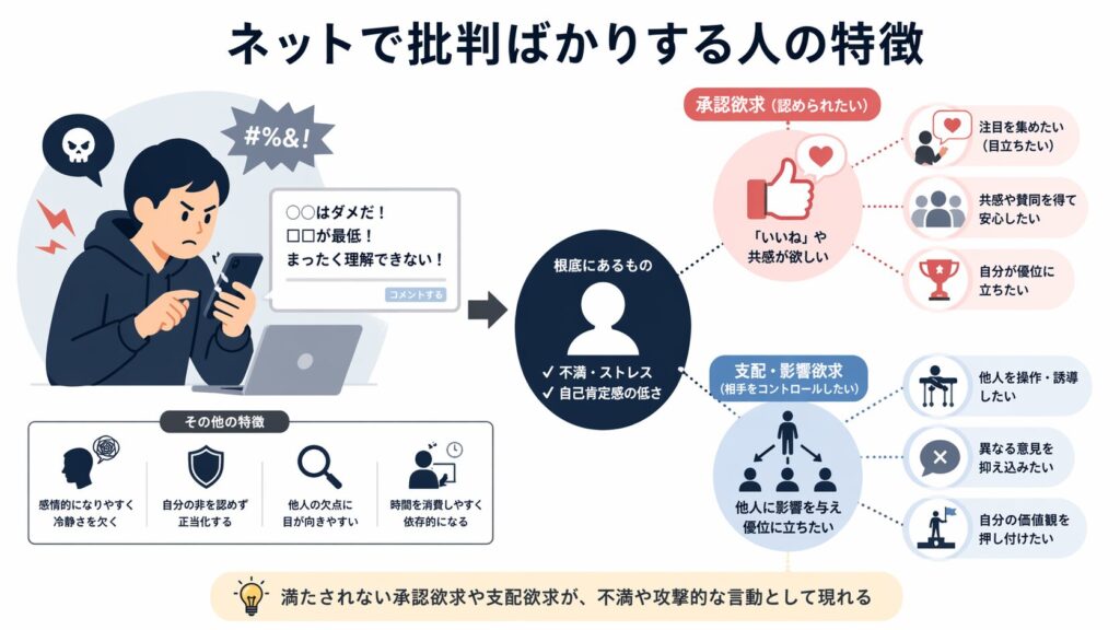 - 影響力を持ちたい: 他人を支配したい、もしくは自分の存在感を示したいという欲求から批判を繰り返す。