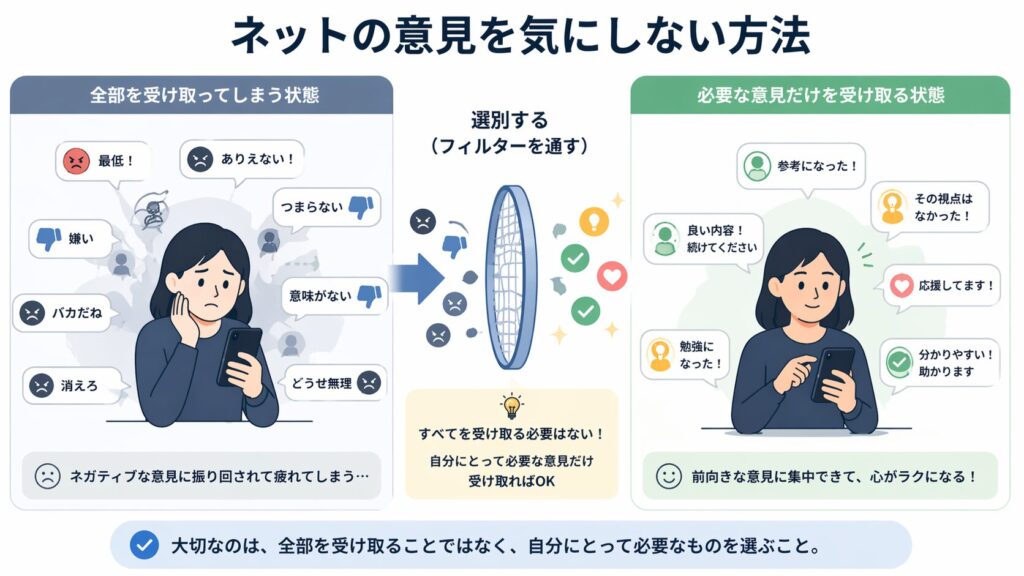 ネット批判に対しても、心のフィルターを活用することで、無理なく受け流せるようになっていくでしょう。