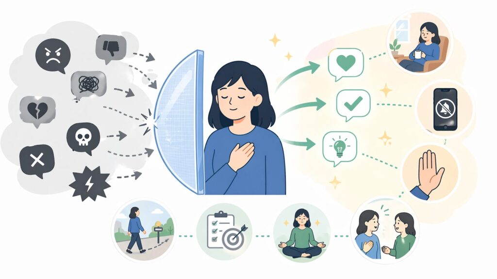 これは、批判やネガティブな意見をそのまま心に受け入れるのではなく、「自分にとって重要な情報だけを取り入れ、不要なものは受け流す」ためのフィルターを意識的に使う方法です。