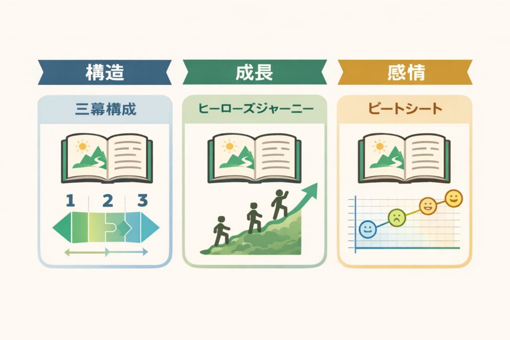 三幕構成(物語を3つの流れで考える型)や、ヒーローズジャーニー(主人公の成長を描く型)、ビートシート(感情の山と谷を設計する型)などを、「何が違って、どう使えばいいのか」まで分かりやすく解説。