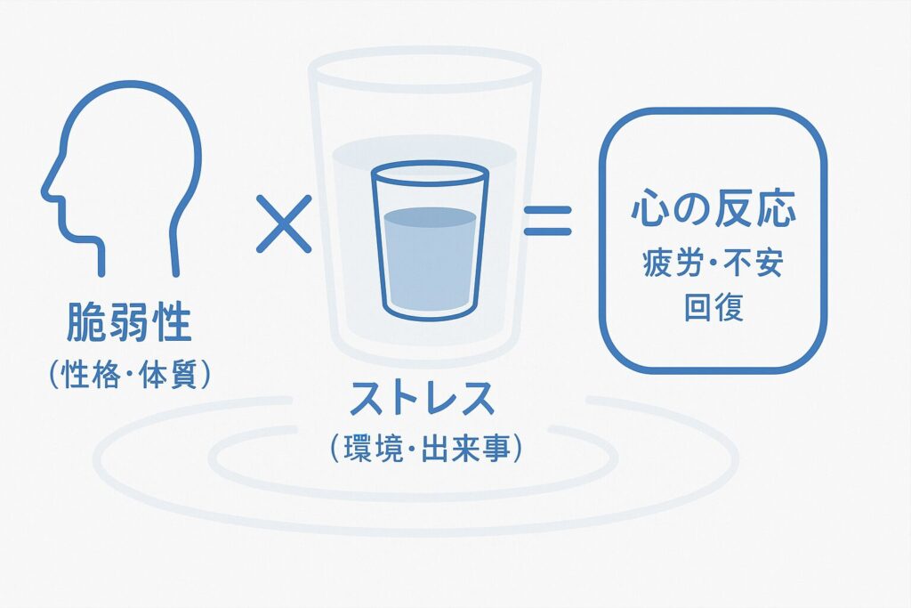 私たちの心は、生まれ持った脆弱性(体質・性格・神経の特性)と、外からのストレス(環境・出来事)の組み合わせによって反応が変わります。