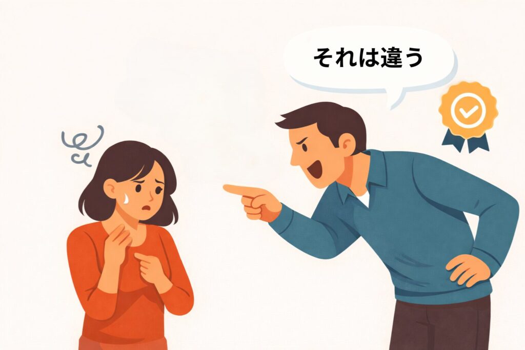 たとえば、「それは違う」「こうするべき」と断定的な言い方が多く、相手の意見を検討しようとしません。