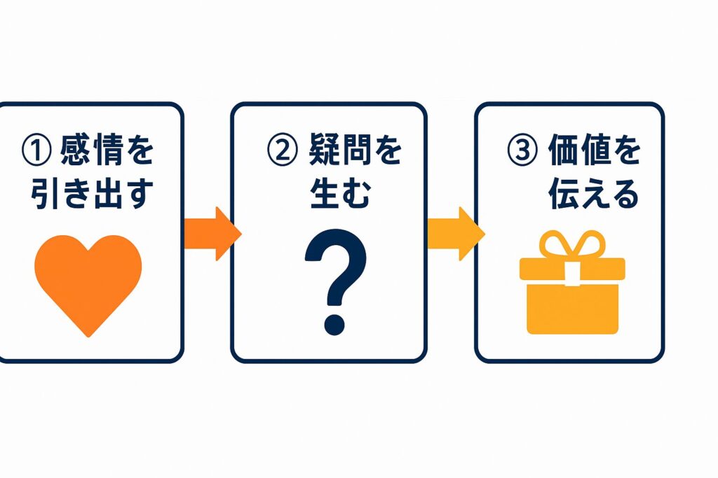 釣りタイトルを“エシカル(誠実)”に使うためには、3つの構成ステップを意識すると効果的です。