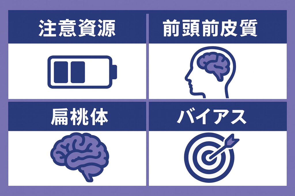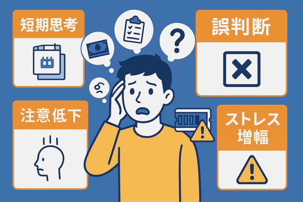 - 注意が1点に過剰集中し、長期的な思考や選択肢が見えなくなる