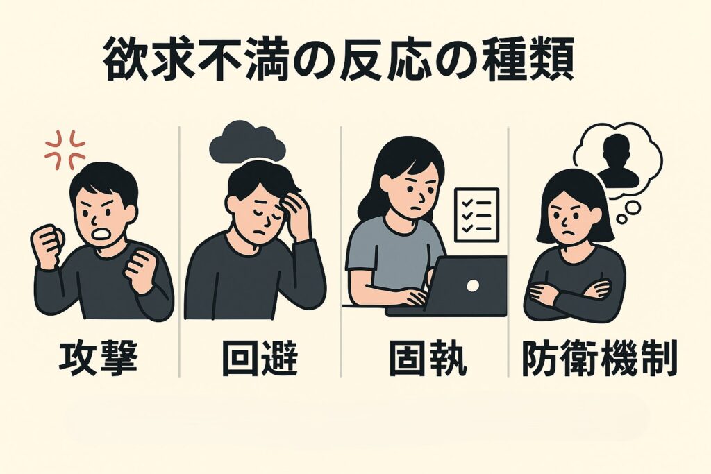 欲求不満の反応の種類|攻撃・回避・防衛機制・固執行動の4つの反応