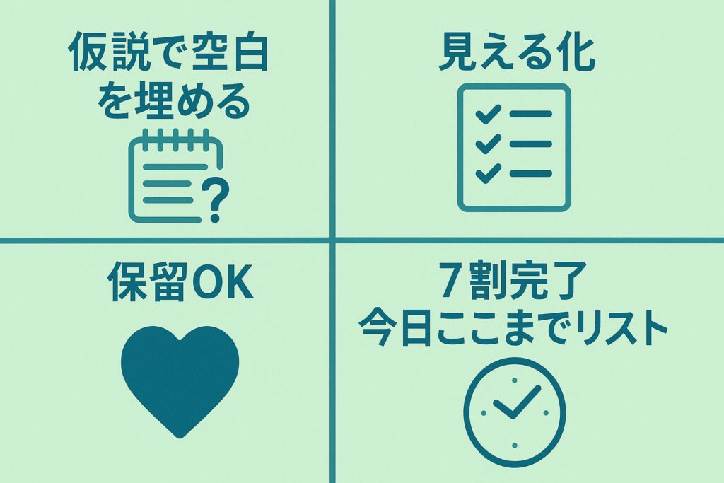 - 「仮説で区切る」「見える化」「リフレーミング」「7割完了」「今日ここまでリスト」など